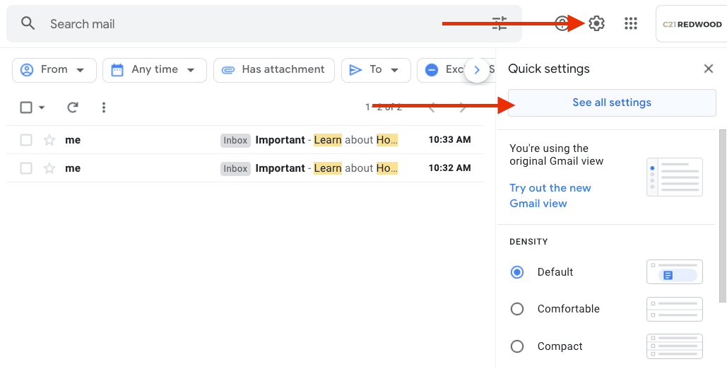 To begin setting up the way you want your Gmail inbox to look, log into your Gmail account. On the right-hand side, you’ll see a widget that looks like a gear. Click on that, and click on Settings.