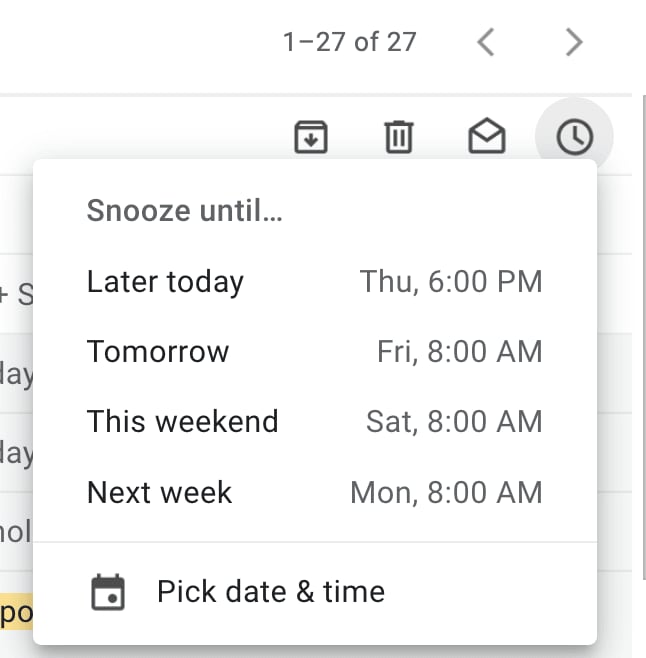 Gmail’s snooze feature allows you to snooze a message until later – your choice. Snoozing an email means that it will disappear from your inbox until the appointed date and time.