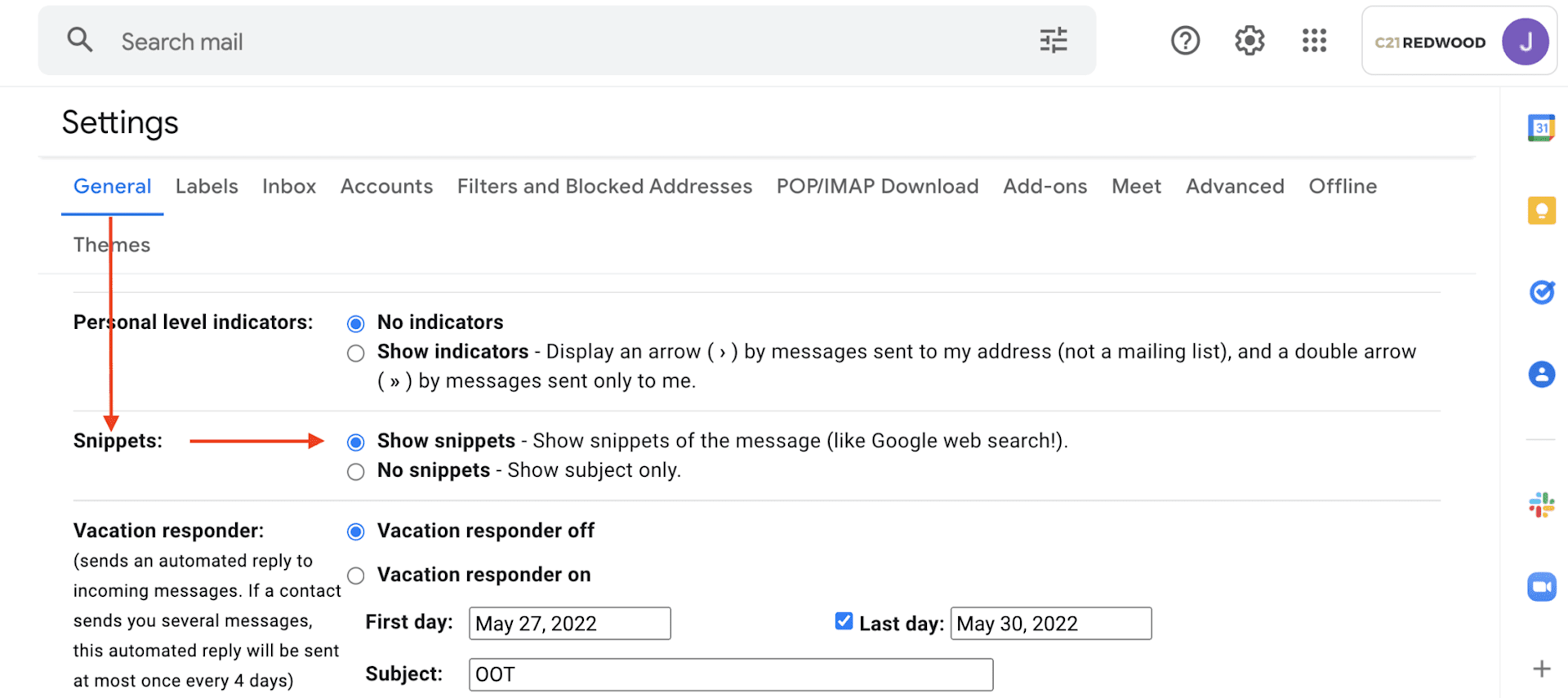 The Settings area is also where, under the General tab, you’re able to determine how many emails you see at one time on one page, where you can turn your desktop notifications for incoming emails on and off, where you can create a customized signature for all your outgoing emails, and where you can even turn on Snippets, which allow you to see parts of each email message before you even open it!