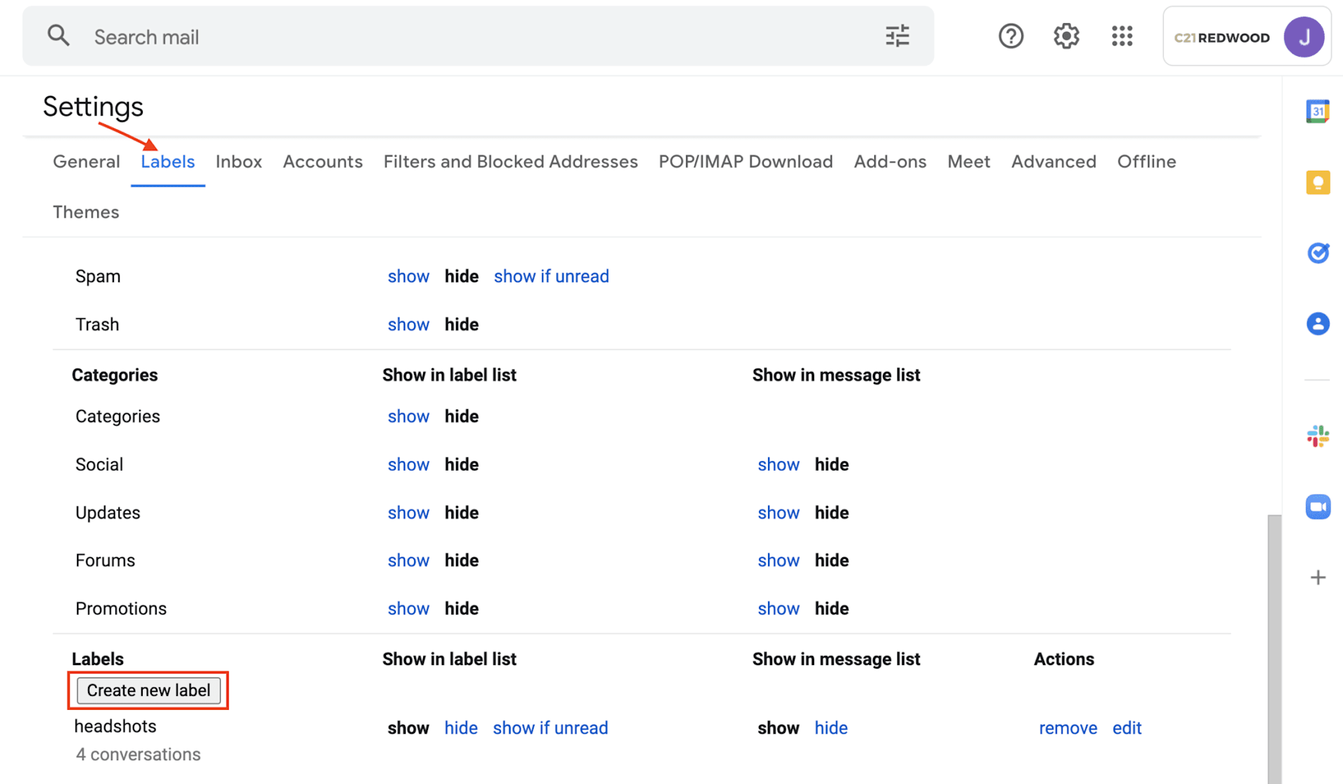 To create a Label in settings, go to your Gmail Settings and click on the Labels tab. Scroll down until you see the ‘Create New Label’ button under Labels.