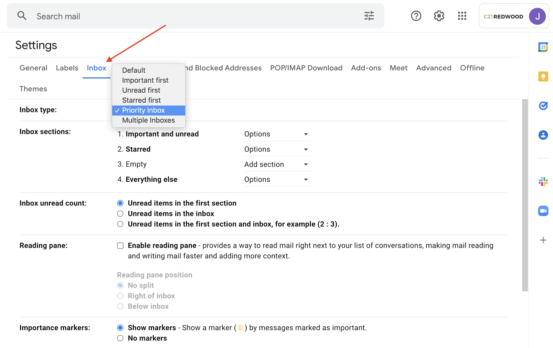 From there, you’ll want to select the Inbox tab. The first selection available to you, Inbox Type, helps you determine what the overall layout of your inbox should look like. For example, choosing Priority Inbox will automatically separate your messages into three categories: important and unread, starred, and everything else. (If you select Priority Inbox, you’ll also be able to customize the settings for each category further.)