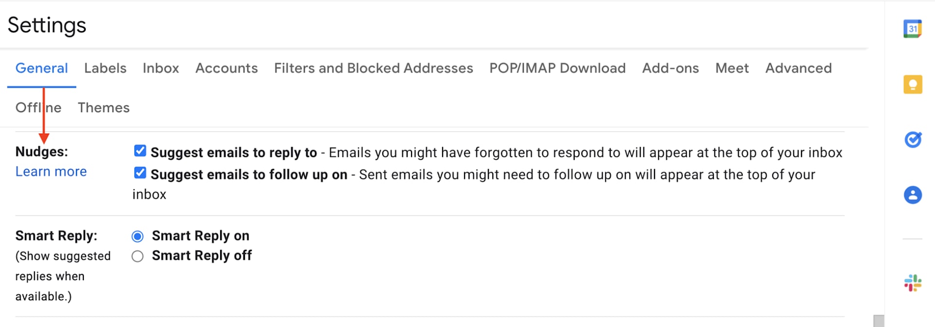 Gmail can also ‘remind’ you about emails you may not have responded to in a while. These are called Nudges, and you can find their settings under the General Tab in Gmail Settings. With Nudges enabled, you’ll not only be able to see those messages that may still need responses; Gmail will also move those messages to the top of your Inbox, so you get a visual cue as well.