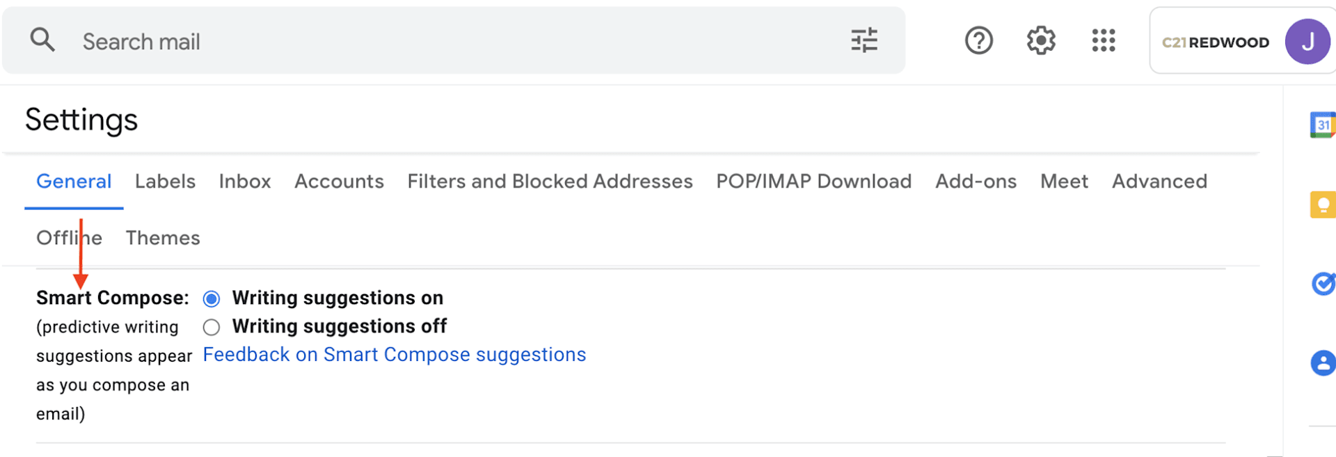 When this feature is turned on in your Settings (under the General tab), Google will give you autocomplete suggestions for your words and phrases as you start to type messages. It will also begin to ‘learn’ your preferred phrasings and messages to offer them as options as you continue to use Gmail.