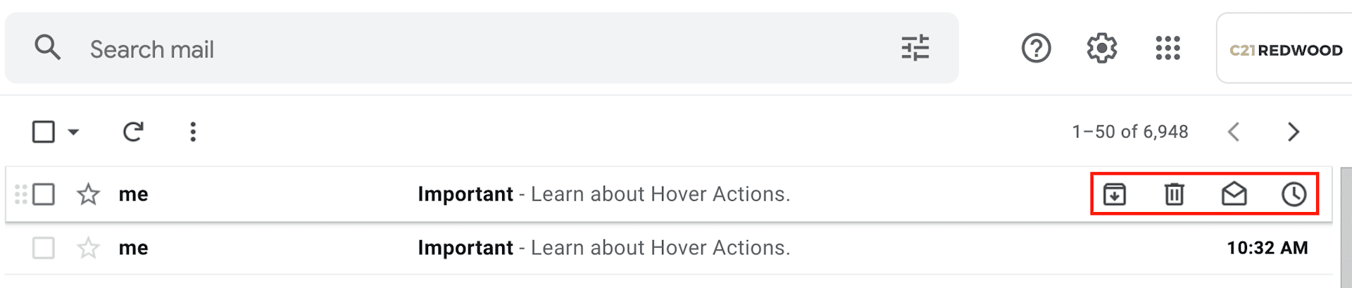 Hover Actions give you the ability to make decisions about messages straight from your inbox by only clicking on one icon to the right of the message, as seen below. You can choose from: Archive, Delete, Mark as Read, or Snooze.